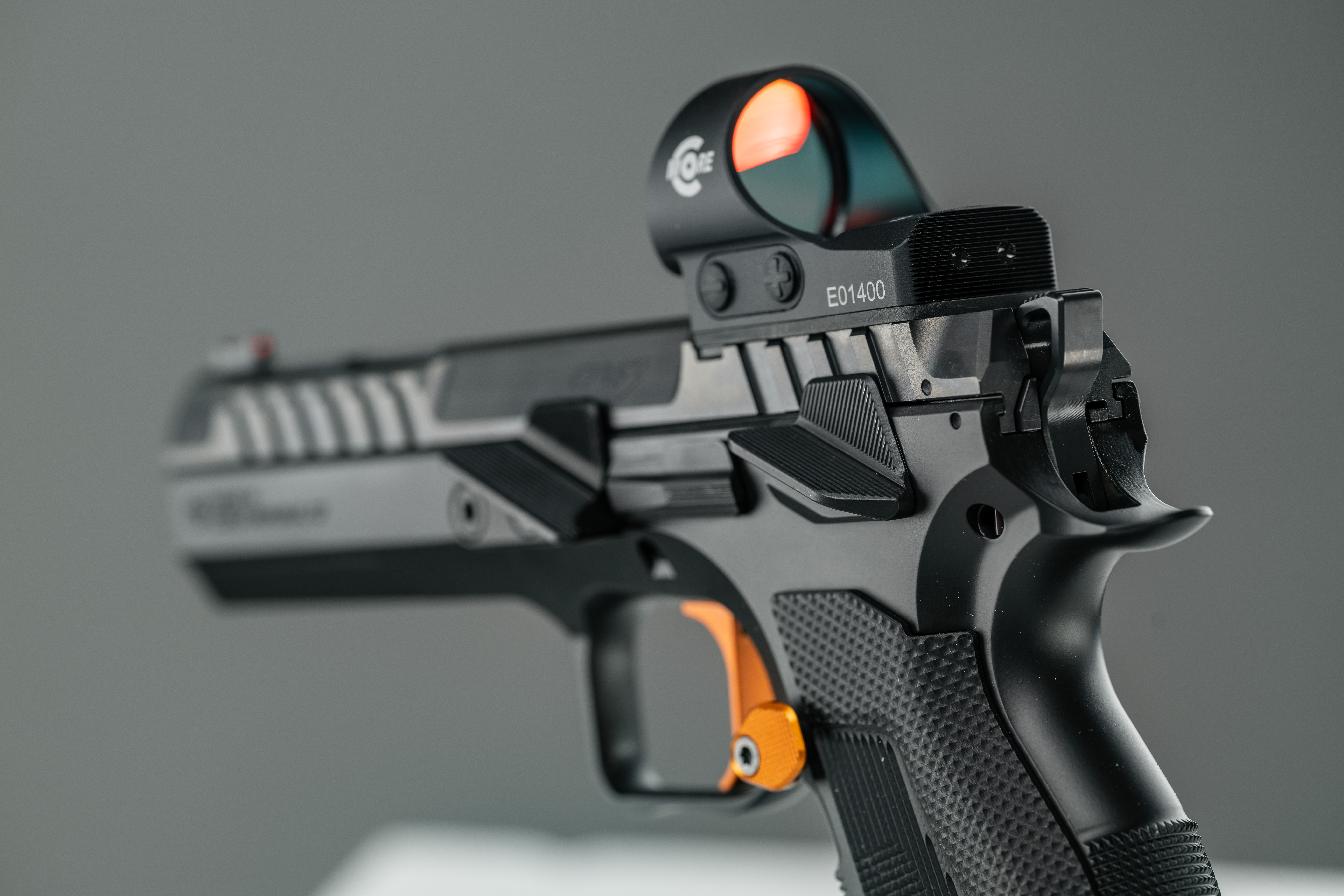 La ergonomía se ve mejorada aún más por las cachas de material compuesto G10 con una textura distintiva, un apoyo para el pulgar rediseñado con un perfil de placa trasera más alto para eliminar el contacto del pulgar con la corredera, y un seguro manual con el mismo ángulo de 25° que el apoyo para el pulgar para un funcionamiento más natural e intuitivo. Un gatillo de acción simple con un recorrido corto y limpio y una presión de aproximadamente 600 g, junto con un botón de liberación del cargador mejorado y ajustable, permiten una recarga rápida y consistente y un control máximo de la pistola a velocidades de competición.